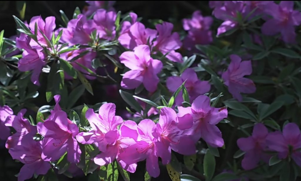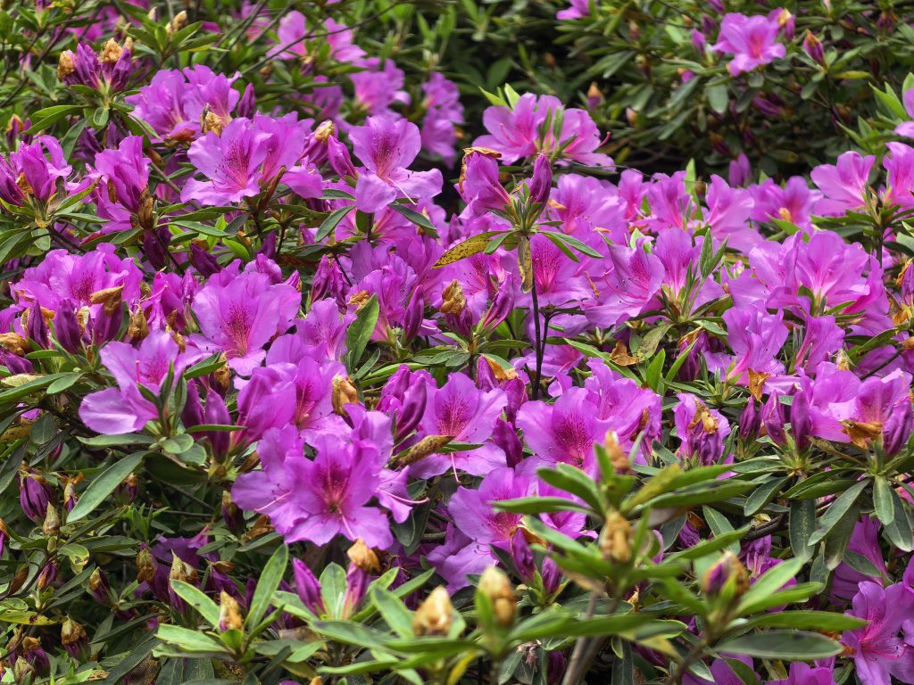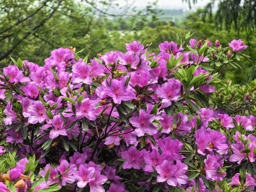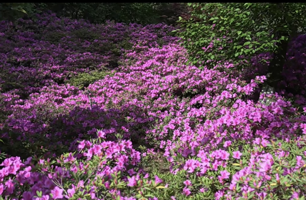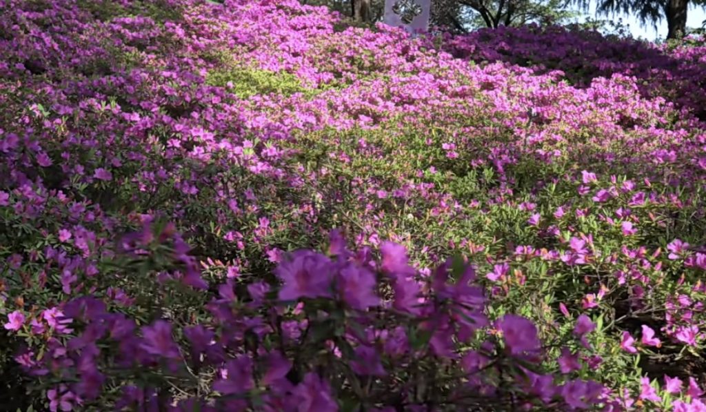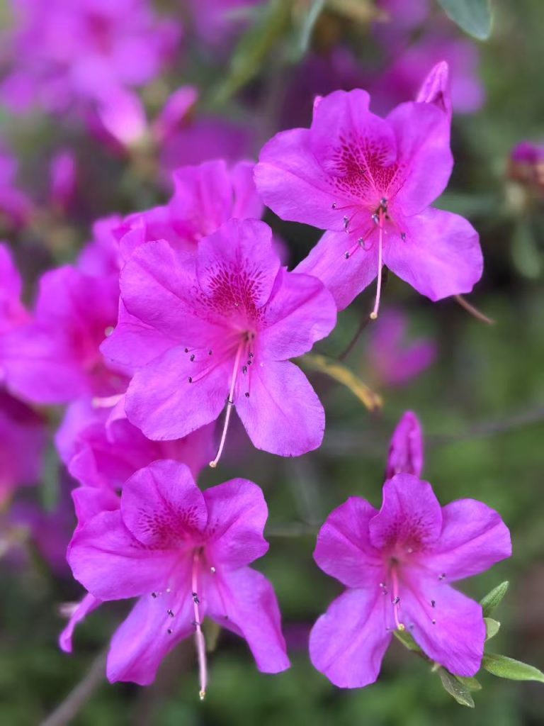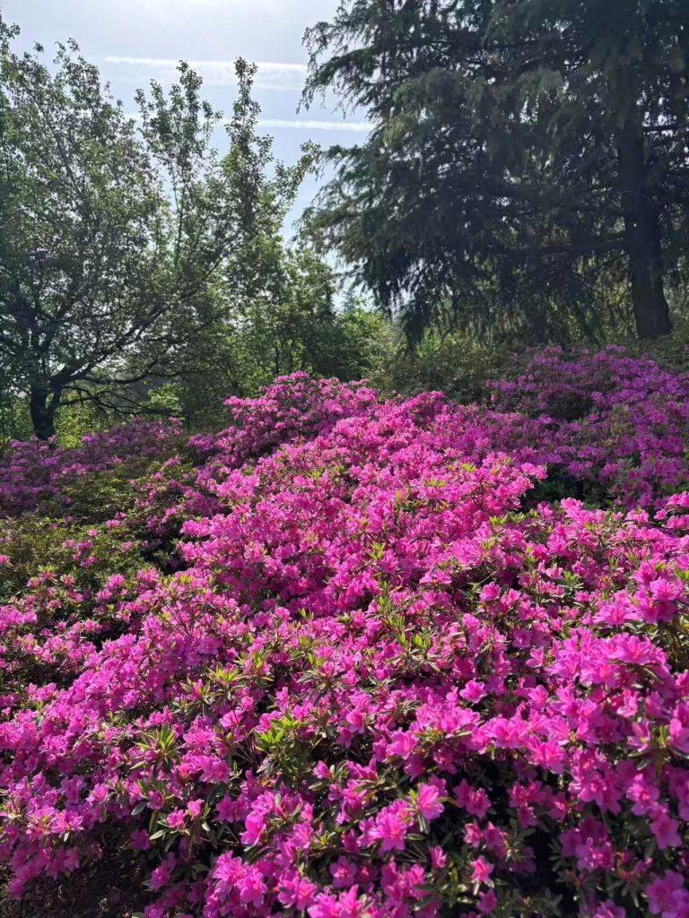 园内杜鹃以柔和的粉色为主,枝桠间缀满花苞与盛放的花朵,长势繁茂而不张扬,尽显“花中西施”的端庄雅致。
