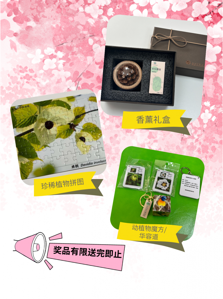 每周六活动现场还有更多精美礼品,完成打卡并在抖音、小红书、视频号等平台发布带#秦岭国家植物园春日寻芳#话题的图文或视频分享,即可参与抽奖