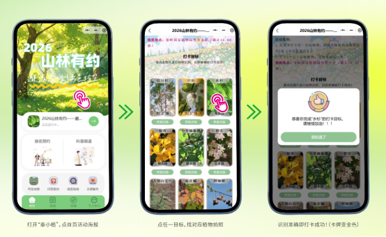 2.点首页海报进入活动页面,点任一目标,拍摄对应植物照片,识别准确即打卡成功!(卡牌变为金色)