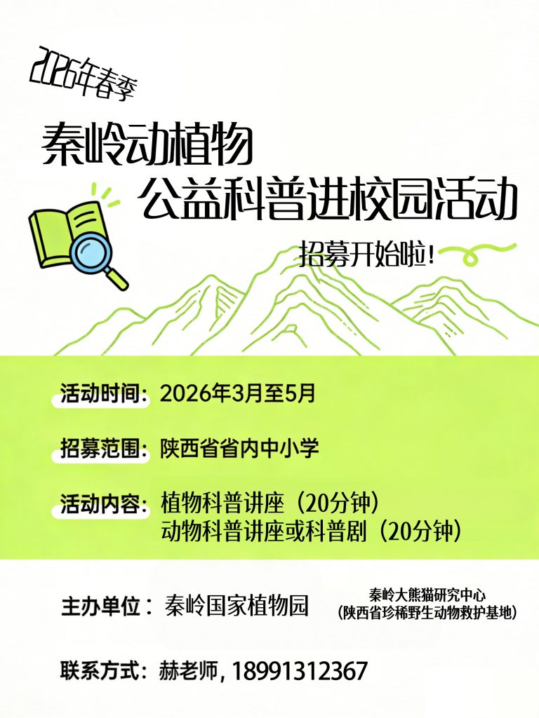 春风送暖,万物复苏。为积极宣传“两山”理念,激发青少年对秦岭的热爱与探究,秦岭国家植物园携手秦岭大熊猫研究中心(陕西省珍稀野生动物救护基地),正式启动2026年春季“公益科普进校园活动”,现面向陕西省内各中小学招募参与学校。 本次活动时间为2026年3月至5月。有两大核心内容:一是植物科普讲座;二是动物科普讲座或同样时长的原创科普剧。总共约一节课的时间。 无论您身处城市还是乡村,只要